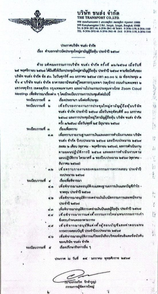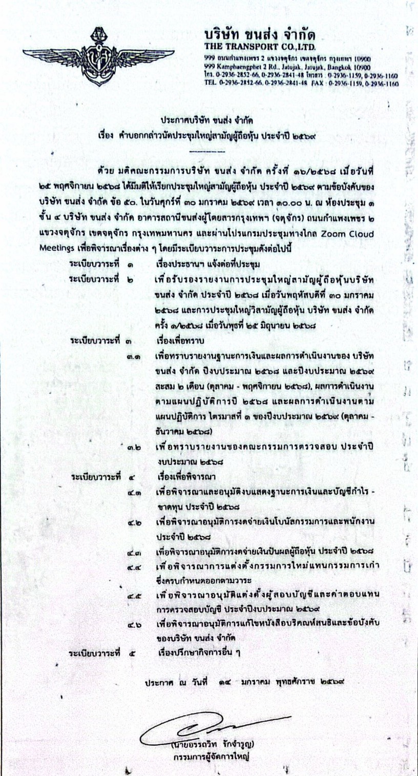 ประกาศบริษัท ขนส่ง จำกัด เรื่องคำบอกกล่าวนัดประชุมใหญ่สามัญผู้ถือหุ้นประจำปี 2569