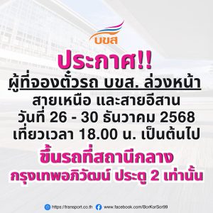 “บขส.” แจ้งผู้โดยสารจองตั๋วล่วงหน้ารถบริษัทฯ เดินทางเทศกาลปีใหม่ เส้นทางภาคเหนือ – อีสาน ตั้งแต่เที่ยวเวลา 18.00 น. เป็นต้นไป ของวันที่ 26 – 30 ธ.ค.2568 ให้ไปขึ้นรถที่สถานีกลางกรุงเทพอภิวัฒน์